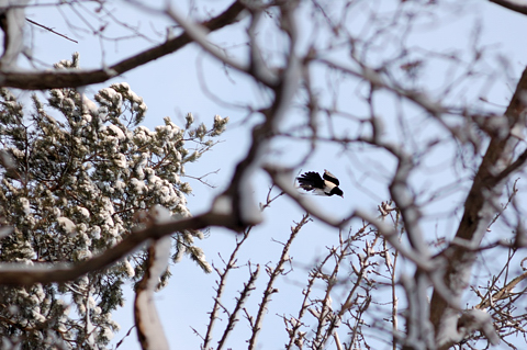 Skatan satt ett tag tillsammans med hackspetten från gårdagens inlägg, i tallen till vänster i bild. Men inte länge.