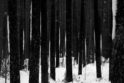 Snöskorpor som kritstreck på furornas stammar. Koposenperä, Norra Österbotten 1 mars vid fyratiden på eftermiddagen. Minskat tonomfång för att förstärka kontrasten. Konverterat till svartvit.