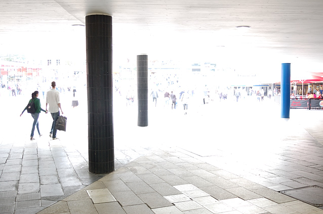 Plattan, Sergels torg igår eftermiddag. Jag var på Kulturhusets Galleri 3 där det just nu visas Tina Enghoffs utställning “Jag är ingenting“. Arrangerade bilder av huvudsakligen karga, kala och urblekta landskap, alla med en människa i motivet, en bruten och uppgiven känsla. Varje bild handlar om ett kvinnoöde, präglat av en lag som dömer till utvisning den invandrade kvinna som bryter sitt äktenskap med sin danske man före 7 års tid. En mycket sevärd utställning.